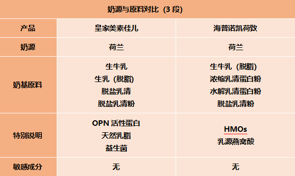 对比说明:奶粉对比主要从品牌背景、奶源与原料、营养与配方等方面展开,本次对比的产品为皇家美素佳儿和海普诺凯荷致奶粉,均以3段为例,下面均省略段位。