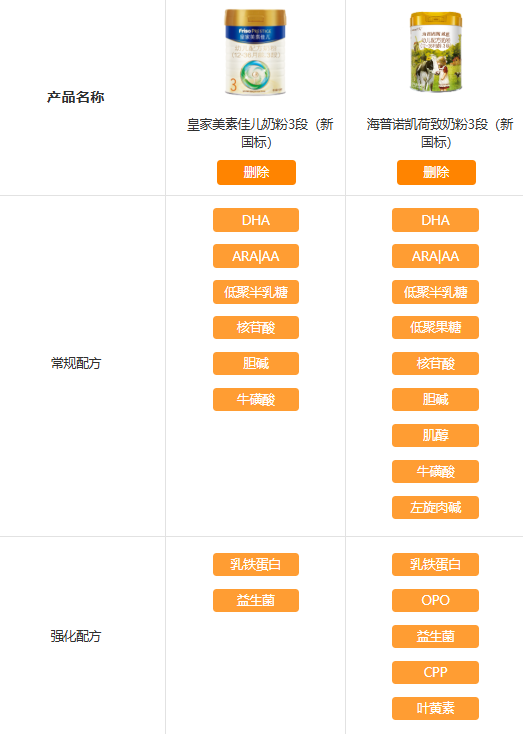 通过奶粉智库网的对比发现,在常规配方方面,海普诺凯荷致比皇家美素佳儿多添加低聚果糖、肌醇、左旋肉碱;在强化配方方面,海普诺凯荷致比皇家美素佳儿多添加OPO、CPP、叶黄素。详情如下图: