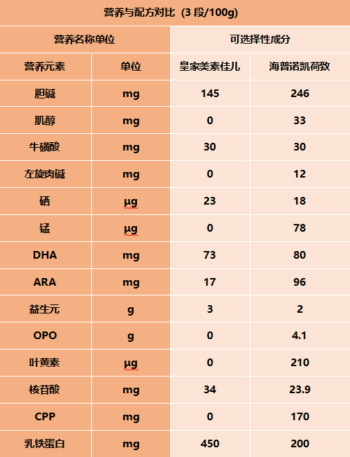 核苷酸方面,皇家美素佳儿比海普诺凯荷致含量高。