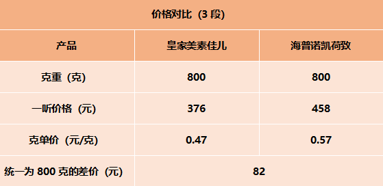 一听皇家美素佳儿比海普诺凯荷致的价格便宜82元。具体对比如下图: