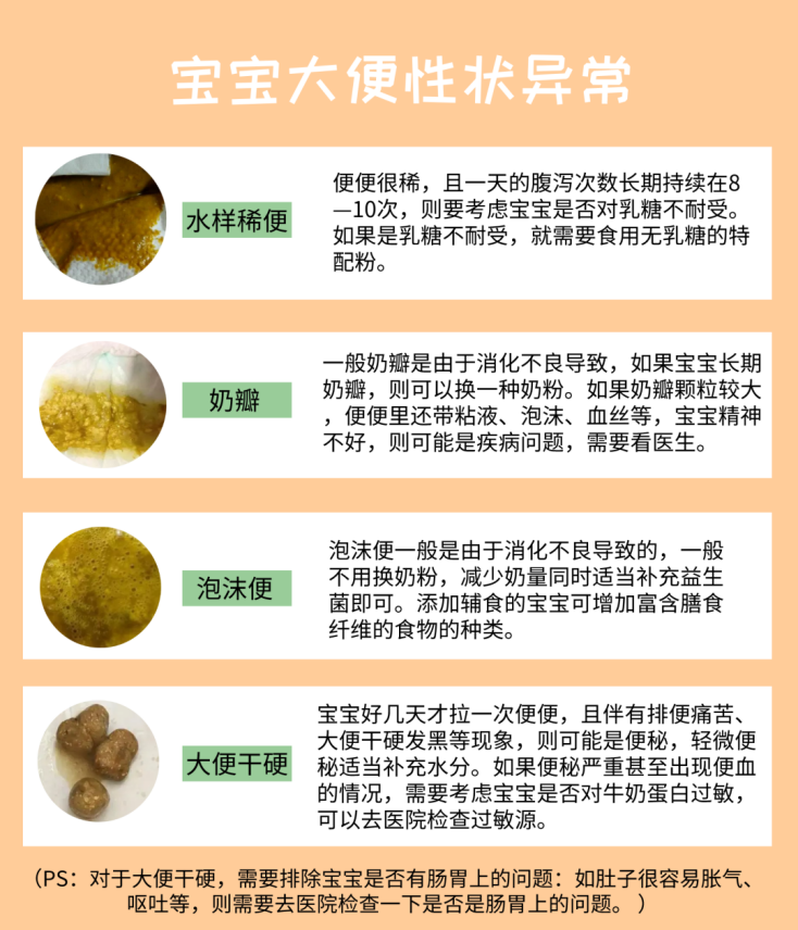 正常情况下,新生儿便便为软糊状,母乳喂养的宝宝大便可能更稀软,也是正常的。如果宝宝的便便性质相比之前,突然变稀、呈现水样、泡沫状,或者突然变得干硬,都是异常的,需要排查原因。可以参考下图应对: