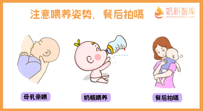 解决办法:建议每次喂奶时,宝妈尽量采用坐喂、半卧位等姿势哺乳,以免宝宝吸入大量空气。喂奶后,给宝宝轻轻拍拍背,防止吐奶。