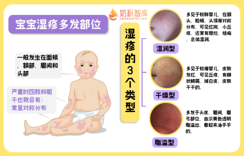 湿疹常见于婴幼儿,一般发生在面颊、额部、眉间和头部,严重时躯干四肢也有,通常也不会有发烧的症状,气温、食物过敏等因素都容易让宝宝不适而起湿疹。