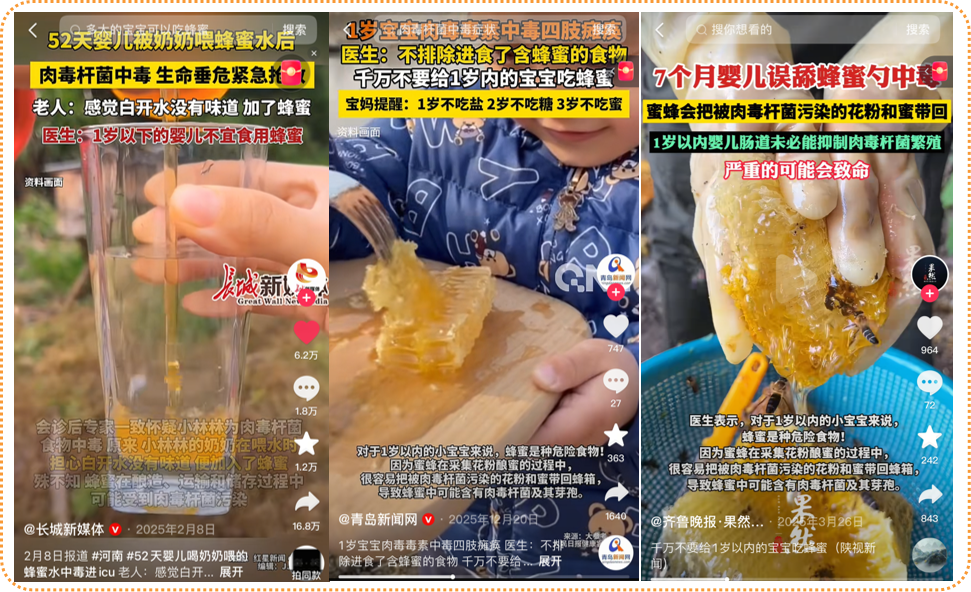 ①蜂蜜:蜂蜜可能含有肉毒杆菌孢子,1岁内宝宝肠道菌群无法抑制其繁殖,易引发中毒,甚至可能威胁生命。误食蜂蜜导致宝宝中毒威胁生命的案例屡见不鲜: