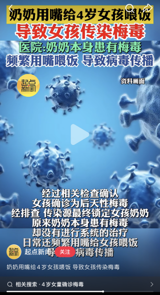 ①嚼碎喂食:成人体内的幽门螺杆菌、疱疹病毒等会直接传染给宝宝,宝宝免疫力低,极易感染生病。最近就有“奶奶用嘴给4岁孙女喂饭,致女孩感染梅毒”的新闻,听起来离谱但确实是真实发生的事情: