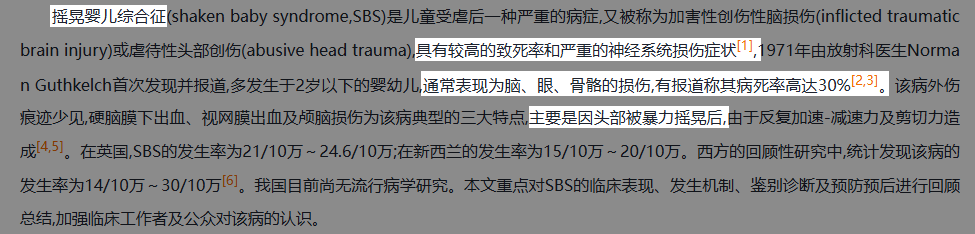 [1]葛林明,赵新雷,李超颖,等.摇晃婴儿综合征[J].白求恩医学杂志,2019,17(05):496-498.