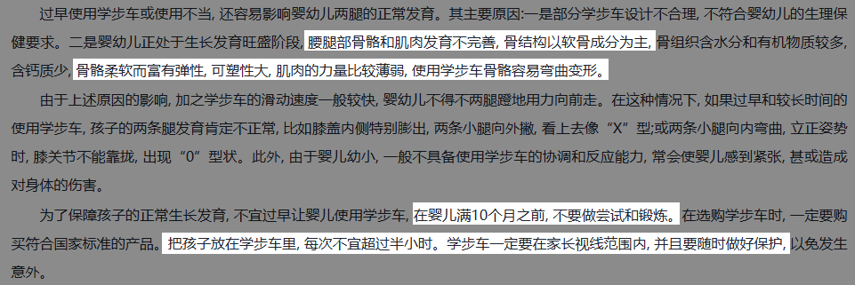 ①不要过早使用学步车:宝宝骨骼和肌肉发育不完善,不符合婴幼儿生理保健要求的学步车不仅不能帮助学步,还会增加“X”或“O”型腿、踮脚走路风险,并有翻倒、滚下楼梯等严重安全隐患。