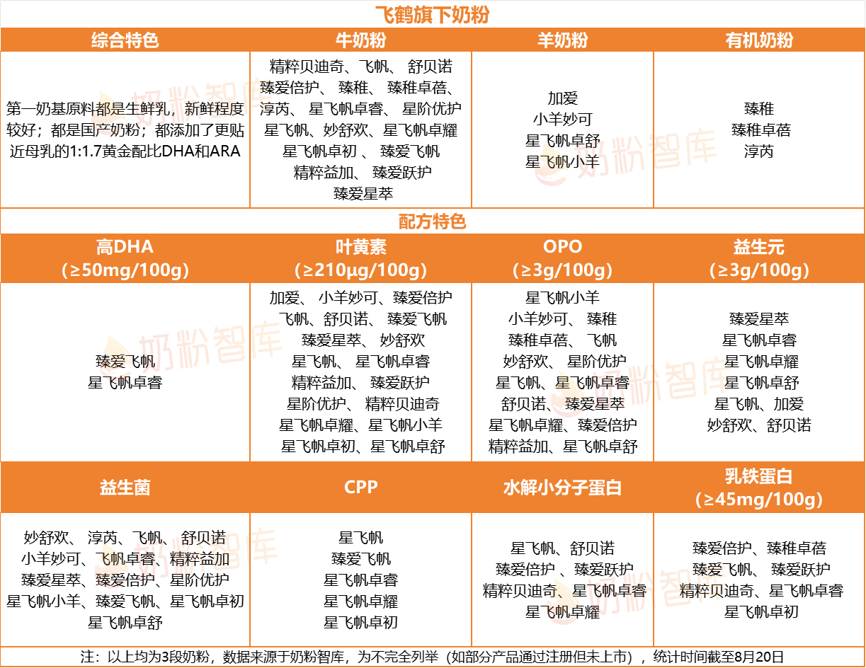 在奶源方面,都采用北纬47°自控牧场奶源,其中星飞帆等奶粉还拥有有机、A2等多种奶源版本。在原料方面,所有奶粉的第一奶基原料都是生鲜乳,这得益于飞鹤全产业链的生产模式,能更好地保留生乳中的营养成分。