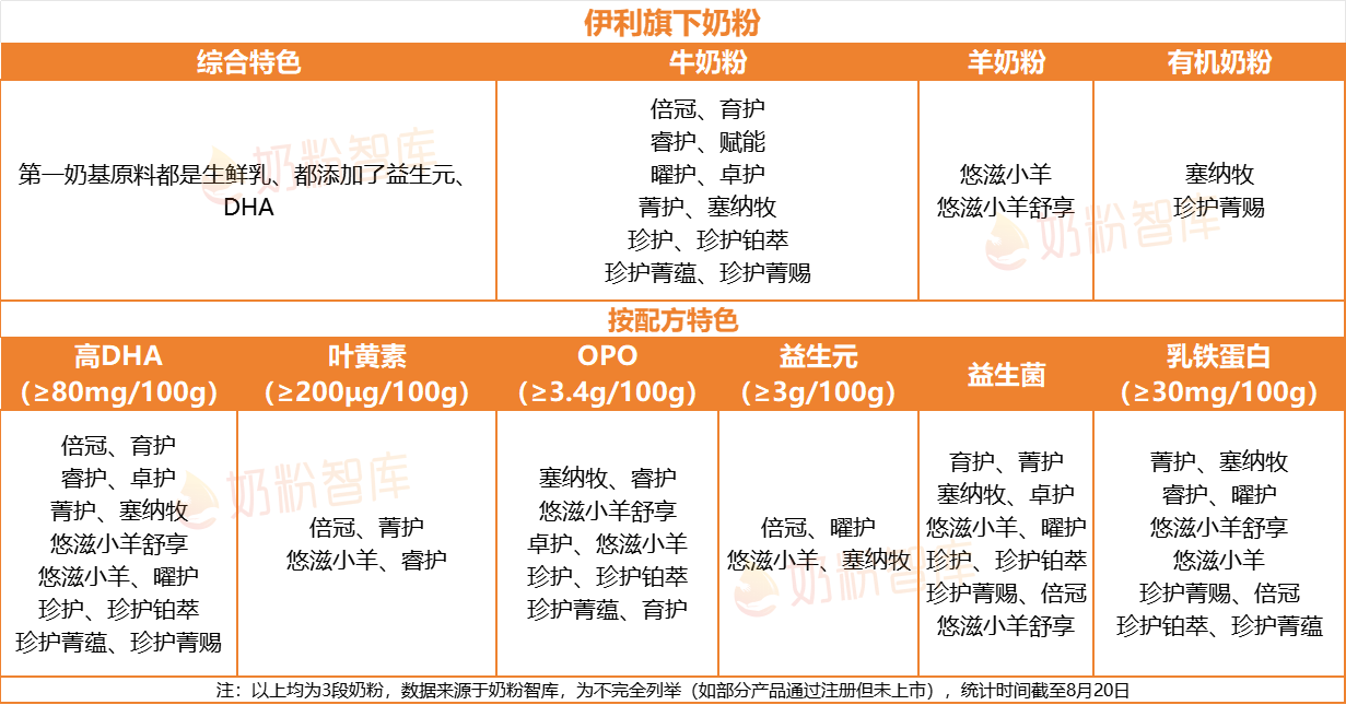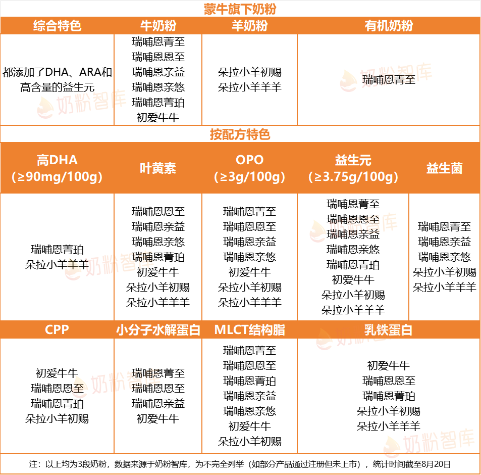 蒙牛旗下的大多奶粉都采用其品牌特有的“专利亲和配方”,实证长高长肉[5],如果宝爸宝妈特别注重这些方面,可以重点关注该品牌的奶粉。