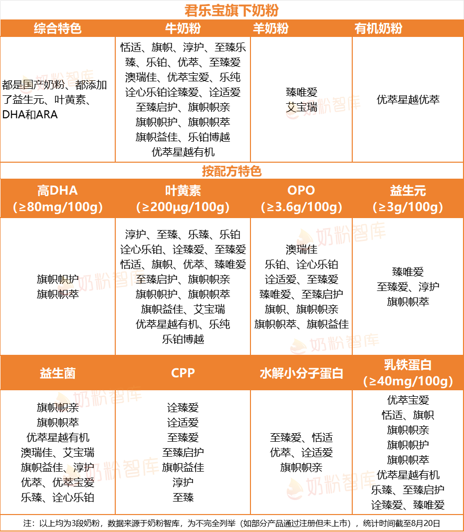 在营养配方方面,脑视力营养的添加上,君乐宝所有奶粉都添加了DHA、ARA和叶黄素,2款奶粉DHA含量≥80mg/100g;20款奶粉的叶黄素含量≥200μg/100g。消化吸收相关营养上,所有奶粉都添加了益生元,其中益生元含量≥3g/100g的有4款;11款奶粉添加了益生菌;19款奶粉都添加了OPO,其中11款奶粉OPO含量≥3.6g/100g;7款奶粉添加了CPP;还有5款奶粉添加了水解小分子蛋白。自护力相关营养的添加上,11款奶粉添加了乳铁蛋白,其中诠臻爱(468mg/100g)是新国标三段奶粉中乳铁蛋白含量最高的奶粉。此外,君乐宝优萃宝爱等系列奶粉中还应用了君乐宝最新研发的“脑体双优”科研成果。