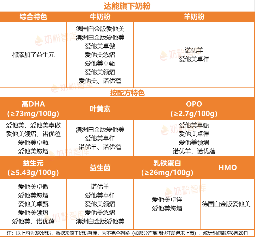从营养配方方面来看,脑视力营养的添加上,9款奶粉添加了DHA,其中6款奶粉DHA的含量≥73mg/100g;4款奶粉添加了叶黄素。消化吸收相关营养上,5款奶粉都添加了OPO,且含量都≥2.7g/100g。自护力相关营养的添加上,达能自主研发的9:1短长链配比益生元[1],能够科学、有效地帮助宝宝肠道内关键有益菌增殖60%+[2],还能帮助宝宝自身免疫系统释放免疫球蛋白slgA[3]。旗下所有奶粉都添加了益生元,其中6款奶粉的益生元含量都≥5.43g/100g;5款奶粉添加了益生菌,其中爱他美领熠等奶粉添加了母源益生菌M16-V;1款奶粉添加了HMOs;2款奶粉添加了乳铁蛋白。