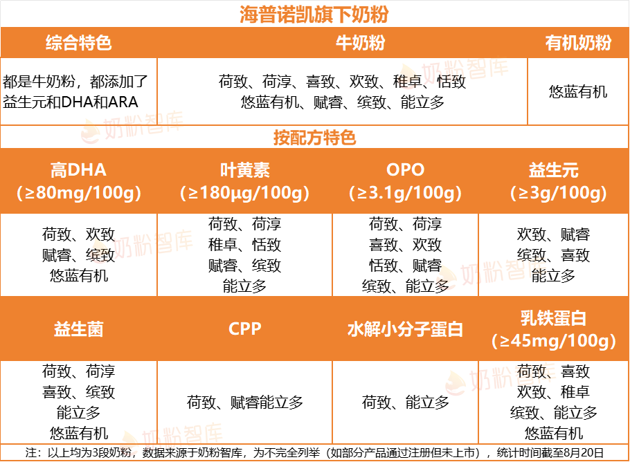 海普诺凯作为宝宝“全面营养”的践行者,旗下大多是全面营养奶粉,如果宝爸宝妈特别注重这些方面,可以重点关注该品牌的奶粉。