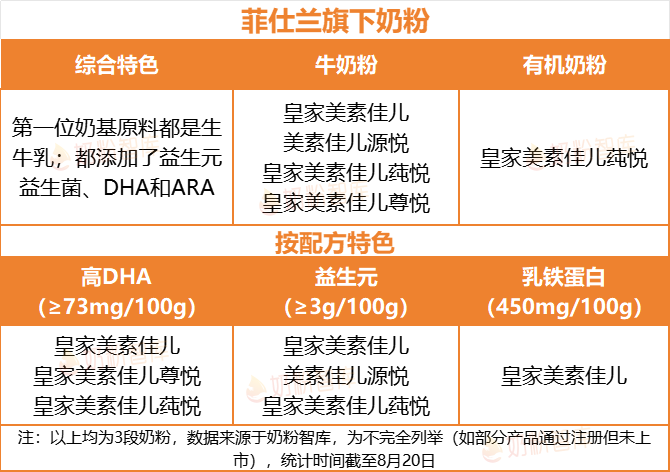 菲仕兰旗下奶粉在原料的新鲜度上都还不错,不同奶粉的配方在益生元、乳铁蛋白、DHA等关键营养素上有差异化配置,宝爸宝妈可以结合配方差异进行针对性选择。