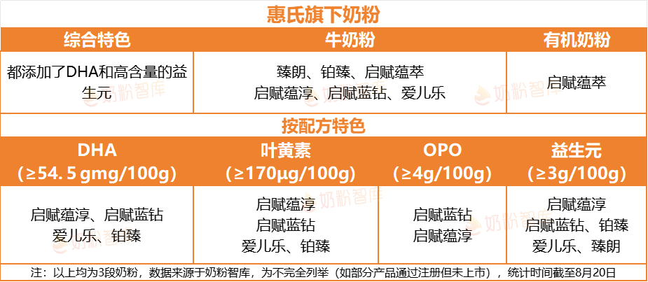 惠氏作为精耕研究HMOs的企业,旗下奶粉大多含有多种具有自护活性的HMOs,不同奶粉的配方在OPO、益生元、DHA等关键营养素上有差异化配置,宝爸宝妈可以结合配方差异进行针对性选择。