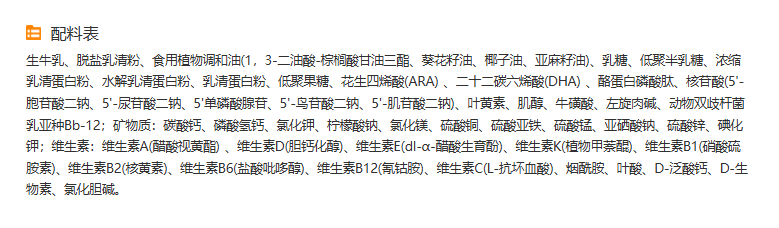 第二,关注配料表靠前位置是否有“脱脂乳粉”等原料,如果配料表中不添加这类原料,那么说明配方中蛋白质来源除了生牛乳,就几乎全部来源于各类乳清蛋白原料。