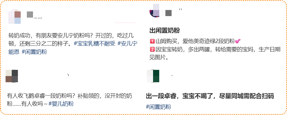 当然了,也有真实闲置的情况,比如有些宝宝不适应某款奶粉,妈妈们就不得不更换品牌;也有些家庭在孕期囤货过多,后来母乳充足导致奶粉剩余;还有一些是品牌育儿补贴领取的奶粉……但这类真实闲置奶粉通常出售数量较少,卖家能够提供清晰的购买记录。