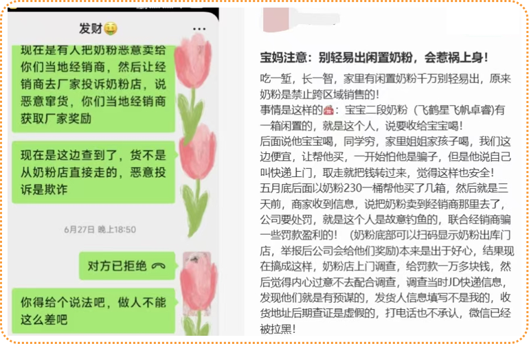 有妈妈表示,自己卖出去的奶粉出现在了外地奶粉店,导致本地的奶粉店被恶意举报并遭受罚款,这其实是被人恶意制造窜货假象,让本地奶粉店“背了锅”,而自己无形中成了这些“钓鱼人”的帮凶。