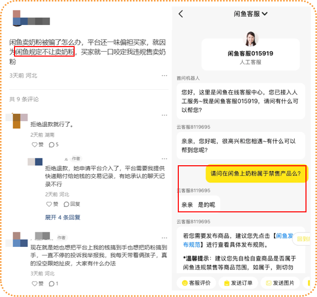 大部分二手交易平台虽允许个人闲置转让,但对婴幼儿食品等特殊品类有严格限制。有些“聪明”的家长会和买家商量好,用其他物品的售卖链接来发货奶粉,但这种行为一旦被平台发现,出售奶粉的账号可能被封号并面临处罚。而且,买家很可能在收货后举报并申请退款,由于交易本身违规,卖家就很难维权。