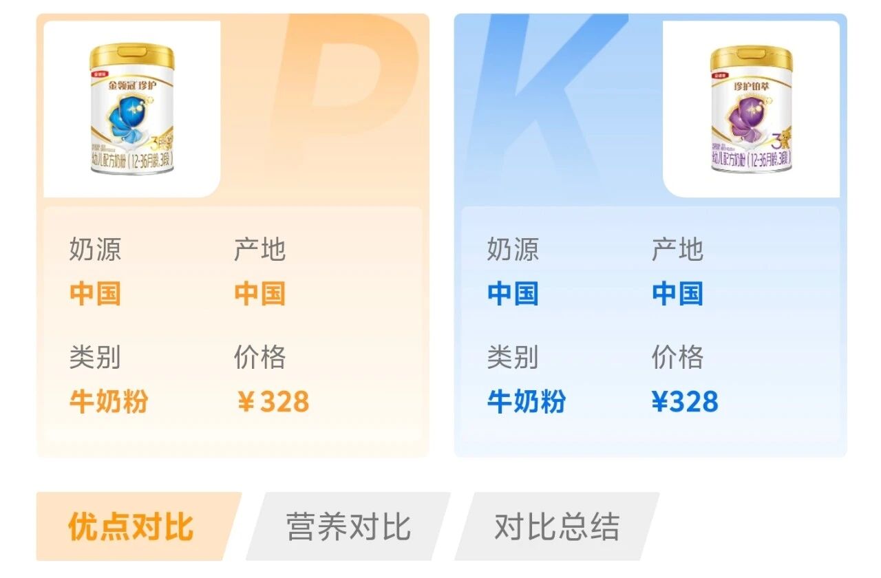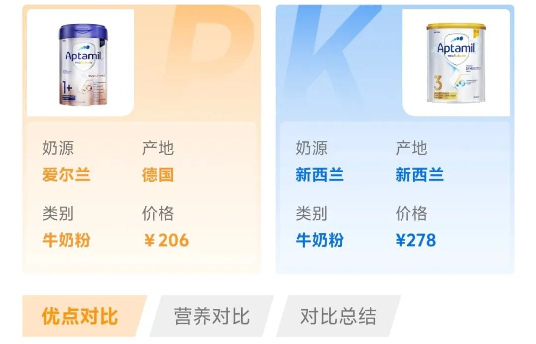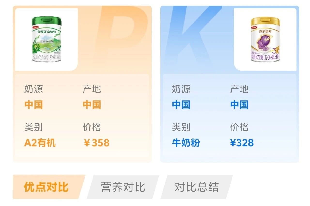 比如都是热门进口奶粉品牌产品,很多宝爸宝妈都会纠结皇家美素佳儿与a2至初、皇家美素佳儿与合生元派星、皇家美素佳儿与美赞臣蓝臻、海普诺凯荷致与a2至初、皇家美素佳儿与海普诺凯荷致。比如跨境奶粉里面,澳洲爱他美白金版与a2Platinum分别属于两大热门外资奶粉品牌爱他美与a2,也是被对比的高频组合。再如国产大品牌飞鹤与伊利金领冠旗下的同级别明星产品飞鹤星飞帆卓睿与金领冠珍护、飞鹤星飞帆卓睿与金领冠珍护铂萃更是被反复拎出来对比。