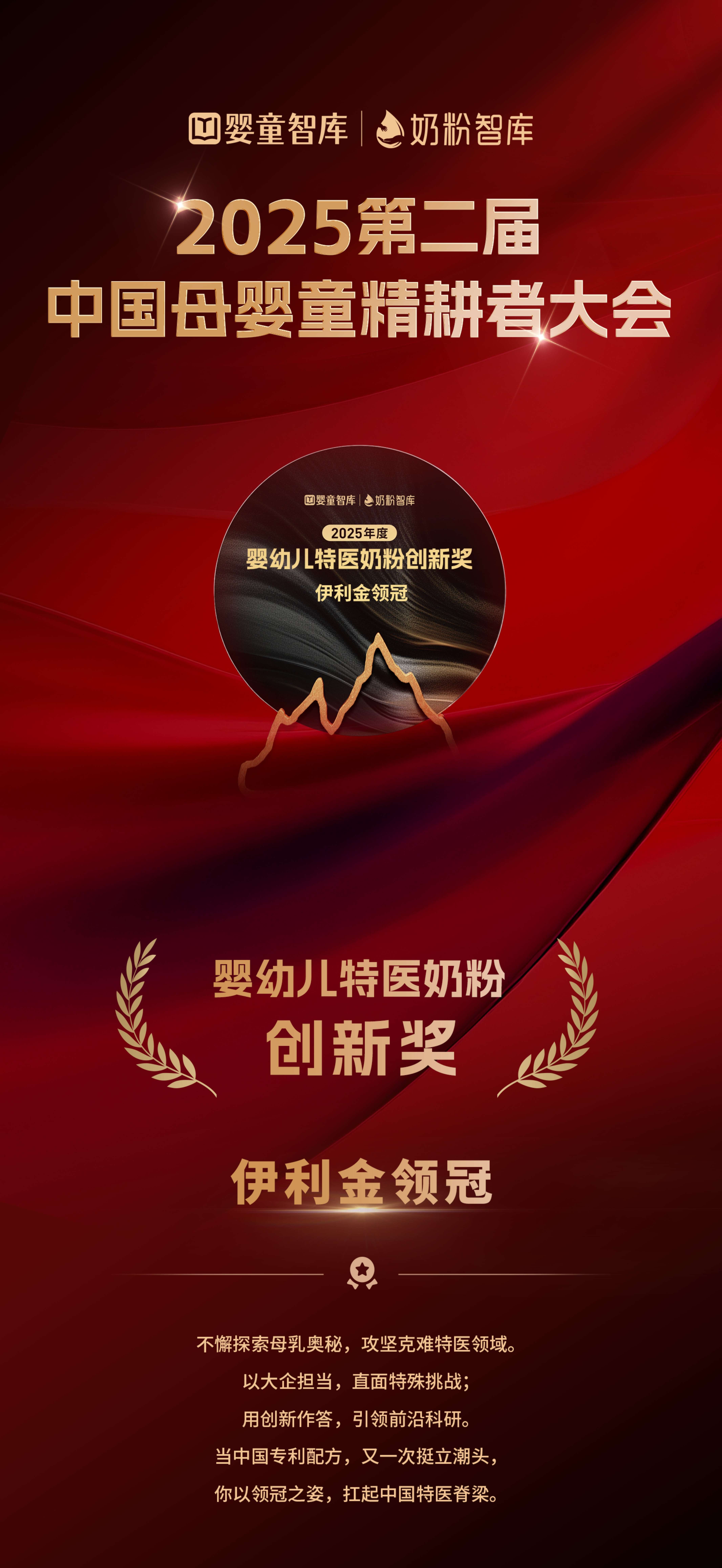不懈探索母乳奥秘,攻坚克难特医领域。以大企担当,直面特殊挑战;用创新作答,引领前沿科研。当中国专利配方,又一次挺立潮头,你以领冠之姿,扛起中国特医脊梁。恭喜伊利金领冠荣获“2025年度婴幼儿特医奶粉创新奖”。