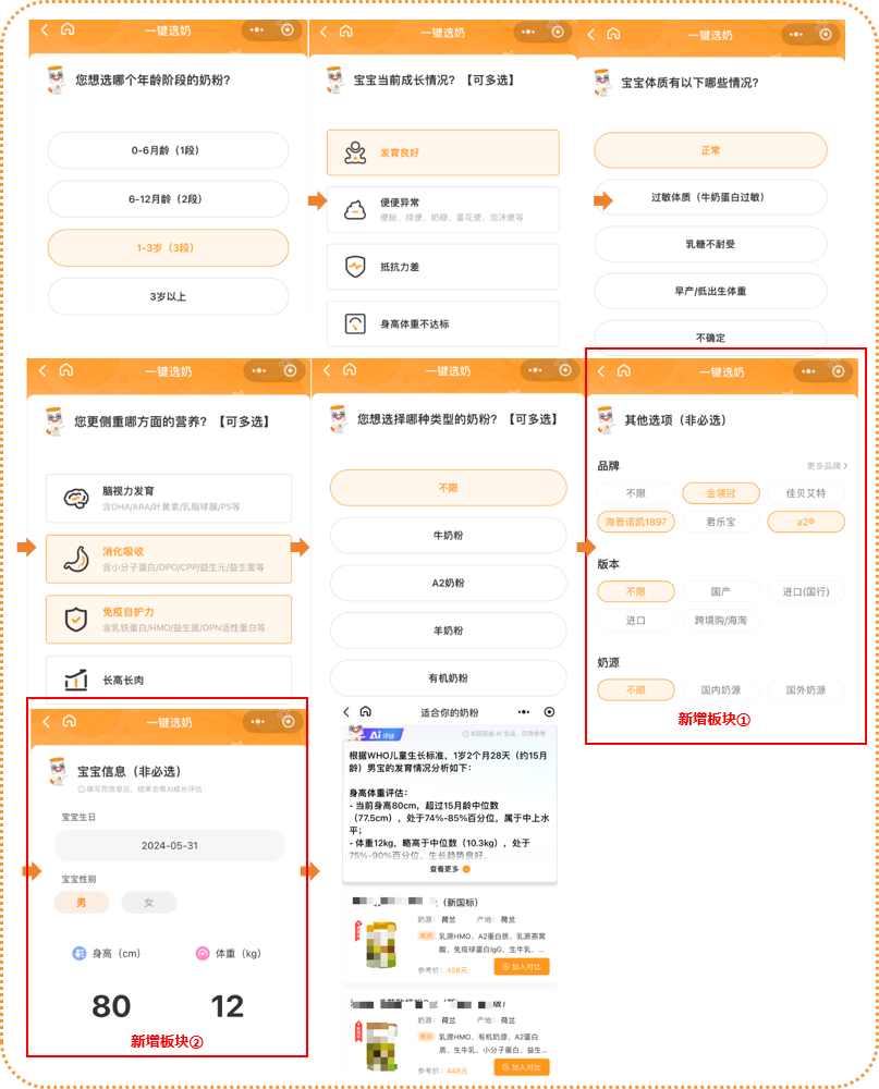 在常规版基础上,“一键选奶(专业版)”新增了两大方向的功能:一是可以根据品牌、版本与奶源筛选奶粉,二是可以对宝宝进行AI成长评估,具体来讲: