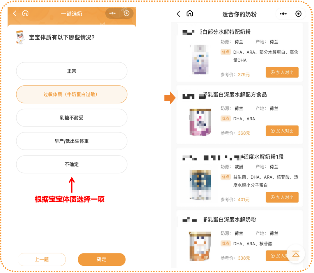 面对早产、蛋白质过敏或乳糖不耐受等特殊体质的宝宝,店员无需担忧无法快速响应顾客需求,也不用担心推荐出错造成不良后果,因为“一键选奶(专业版)”也给出了相应解决方案。