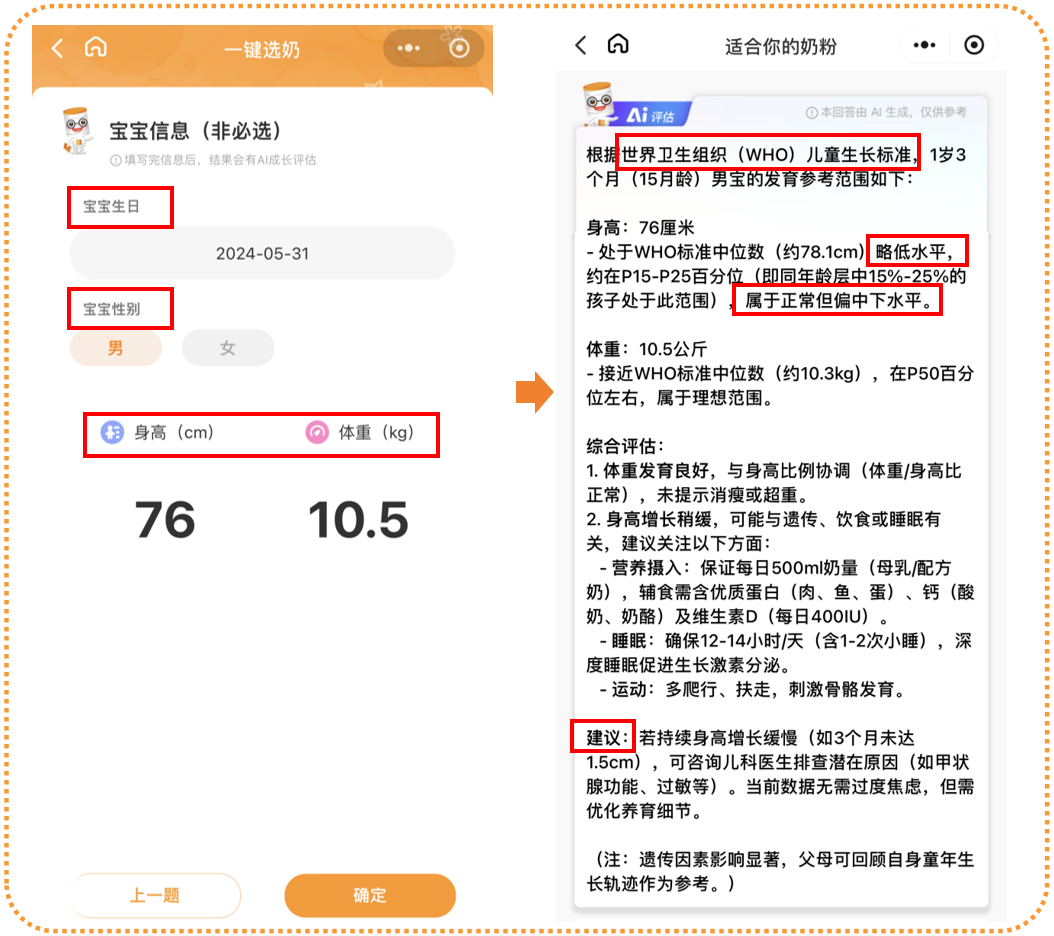 “一键选奶(专业版)”中“宝宝信息”板块能够完美地解决这一问题。店员只需输入宝宝生长发育相关信息,系统就会基于WHO给出的标准生成AI评估报告,客观显示宝宝的身高体重是否达标,并给到一些指导建议。店员可借助报告帮助家长理性认知宝宝真实状况,重新进行“一键选奶”操作,帮助宝爸宝妈们更靠谱和高效地选对奶粉。