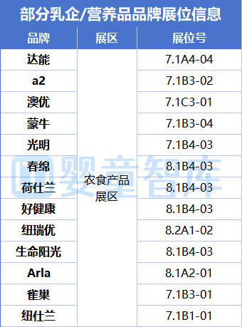 据不完全统计,今年在食品及农产品展区参展的乳企/营养品品牌将有:达能、雀巢、澳优、a2、蒙牛、光明、阿拉福兹(Arla)、春绵、好健康、纽瑞优、生命阳光、纽仕兰、荷仕兰等。