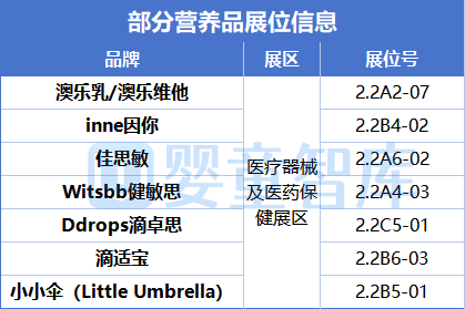 部分营养品品牌如澳乐乳/澳乐维他、inne因你、Witsbb健敏思、Ddrops滴卓思、滴适宝、小小伞、佳思敏等,则将在医疗器械及医药保健展区的1.1/1.2/2.2馆惊喜亮相。