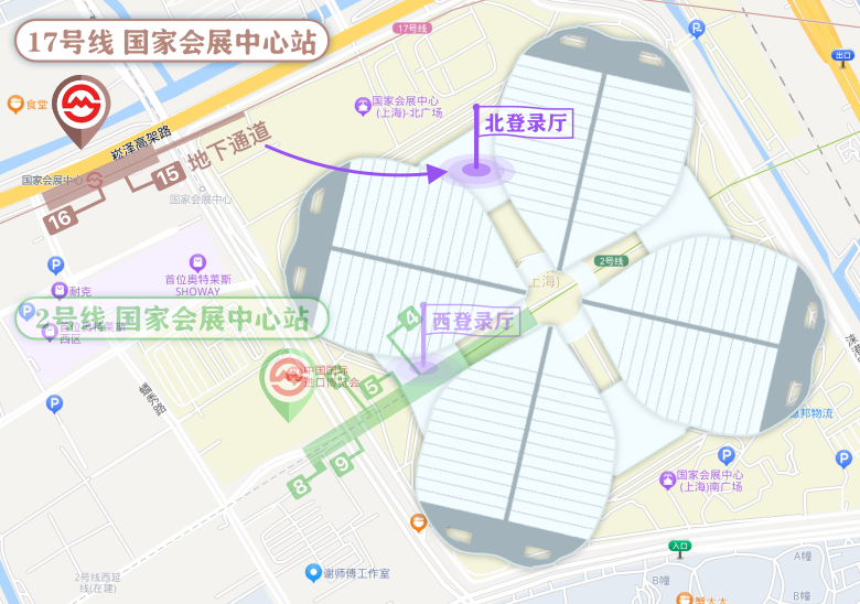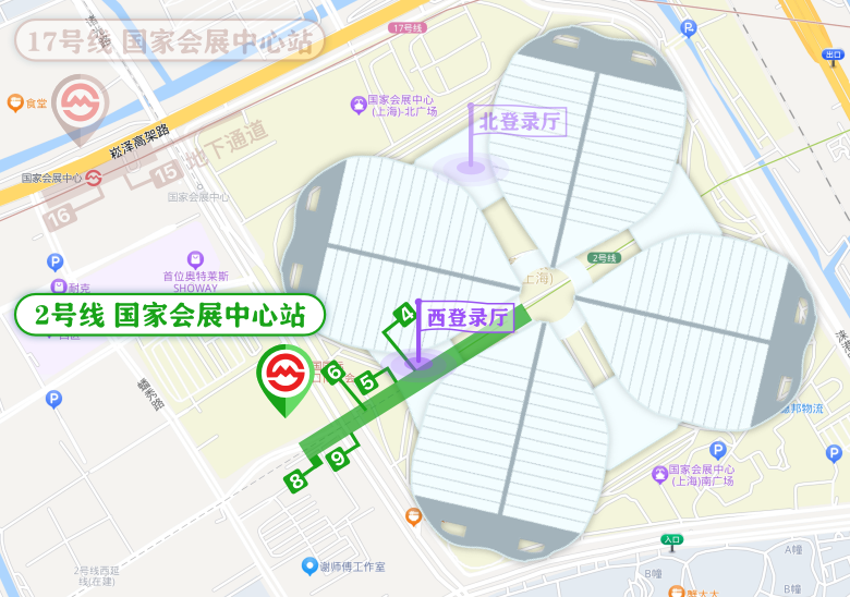 观众到达国家会展中心站后,从4、5、6、8号口出站至场馆西登录厅入场(持进博会证件人员可从4、5号口出站)。温馨提示:由于届时国家会展中心站客流较大,将会根据现场情况采取限流措施,请听从现场引导。