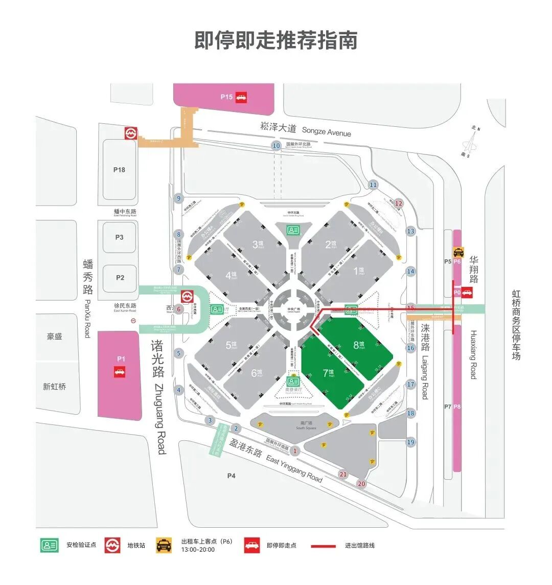 若您是乘坐出租车、网约车,或是仅需将客人送达,可以优先考虑前往P0停车场(全天)或P6、P8停车场(仅上午)的即停即走下客点,通过东侧连廊即可快速到达目标展区。