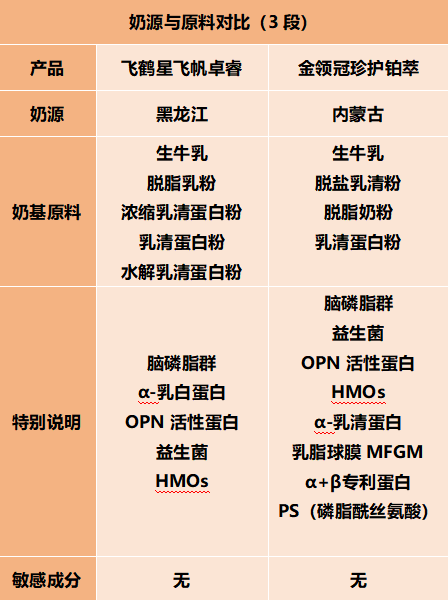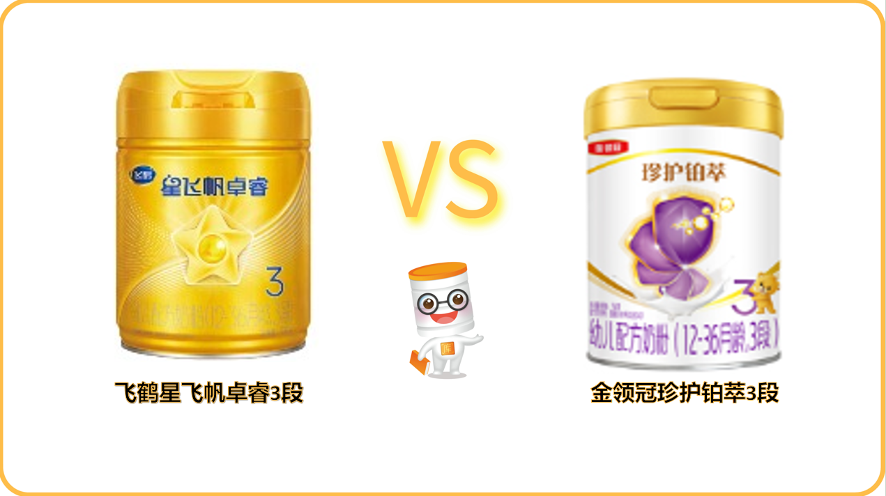 对比说明:奶粉对比主要从品牌背景、奶源与原料、营养与配方等方面展开,本次对比的产品为飞鹤星飞帆卓睿和金领冠珍护铂萃,均以3段为例,下面均省略段位。