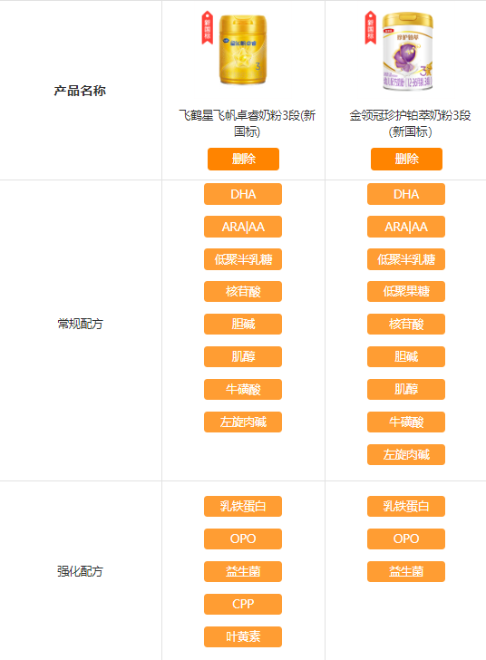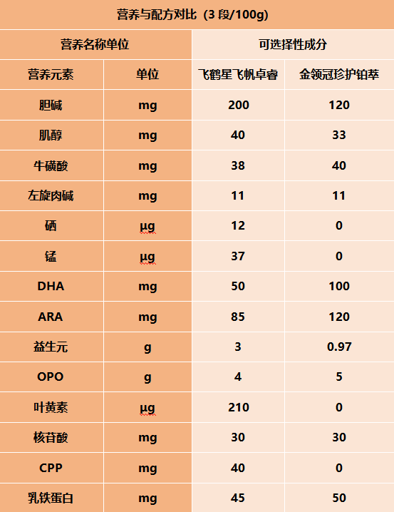 通过奶粉智库网的对比发现,在常规配方方面,金领冠珍护铂萃比飞鹤星飞帆卓睿多添加低聚果糖;在强化配方方面,飞鹤星飞帆卓睿比金领冠珍护铂萃多添加有CPP和叶黄素。详情如下图: