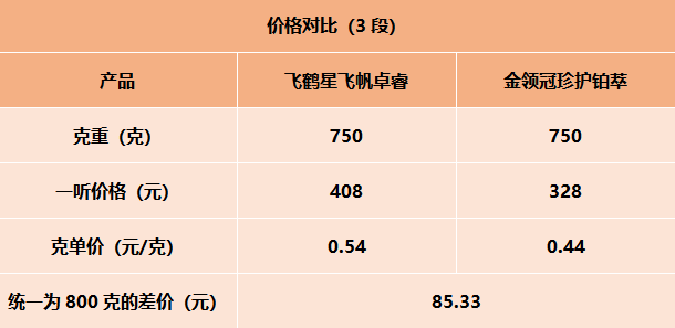 一听飞鹤星飞帆卓睿奶粉要比金领冠珍护铂萃的价格贵80元,但由于克重不同,统一为800g,飞鹤星飞帆卓睿要比金领冠珍护铂萃的价格贵85.33元。具体对比如下图: