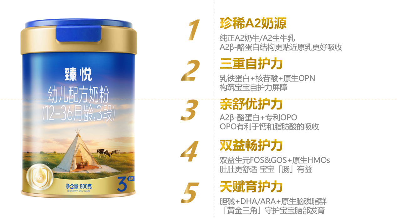 在配方设计上,在A2奶源之上辉山臻悦更以“5维臻萃营养”系统精准护航宝宝成长。该体系涵盖三重自护力、亲舒优护力、双益畅护力与天赋育护力,科学配比、全面覆盖中国宝宝各阶段发育所需,用实力诠释“营养不打折、价格更亲民”,切实缓解家庭的喂养焦虑,让每一罐辉山臻悦,都成为值得信赖的成长陪伴。