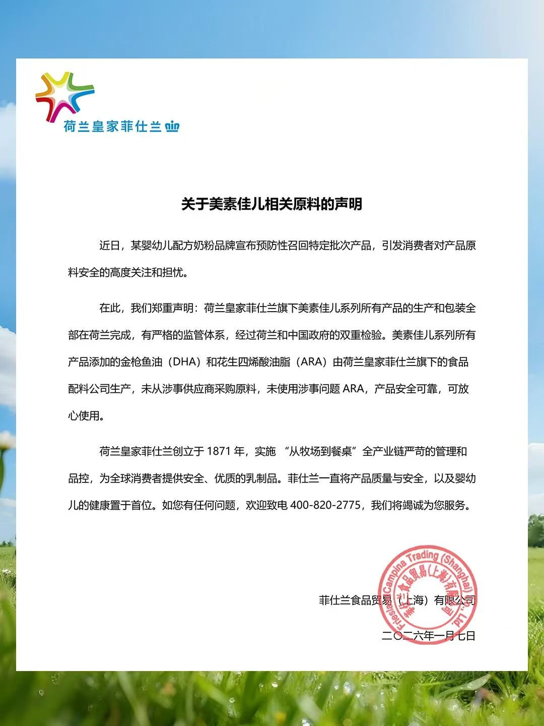 荷兰皇家菲仕兰旗下美素佳儿系列所有产品的生产和包装全部在荷兰完成,有严格的监管体系,经过荷兰和中国政府的双重检验。美素佳儿系列所有产品添加的金枪鱼油(DHA)和花生四烯酸油脂(ARA)由荷兰皇家菲仕兰旗下的食品配料公司生产,未从涉事供应商采购原料,未使用涉事问题ARA,产品安全可靠,可放心使用。