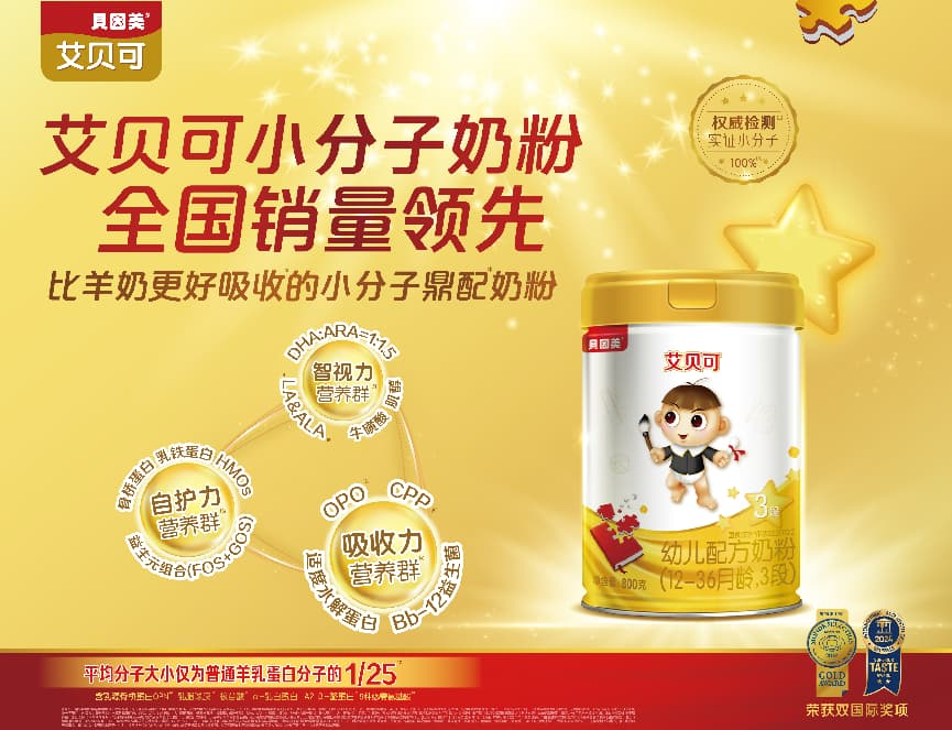 市场表现方面,艾贝可在小分子奶粉领域全国销量领先,并连年荣获国际美味大奖、国际蒙特金奖等行业权威认可,形成口碑与市场的双轮驱动。