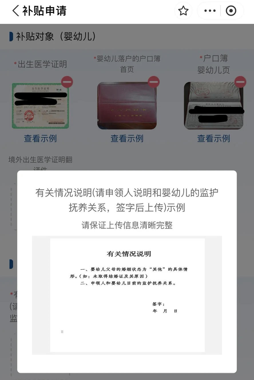 目前,北京、上海、湖南等省(市)的已申领用户反映,如果婴幼儿父母的婚姻状况为“其他”,需提供有关情况说明,说明申领人与婴幼儿的监护抚养关系,签字后上传。其中,上海提供了有关情况说明示例,申领人可参照准备。