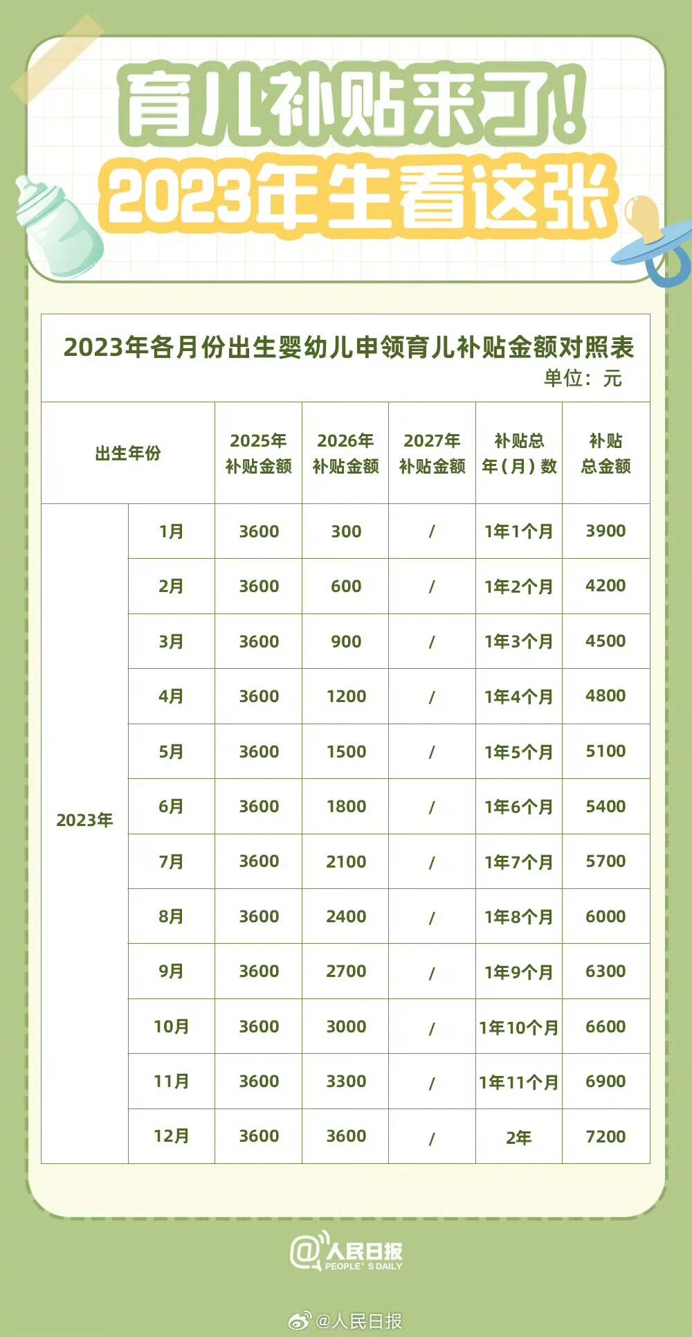 ①育儿补贴按年计算,每年一次性发放。也就是说育儿补贴申领后,可以一次性领取到3600元。