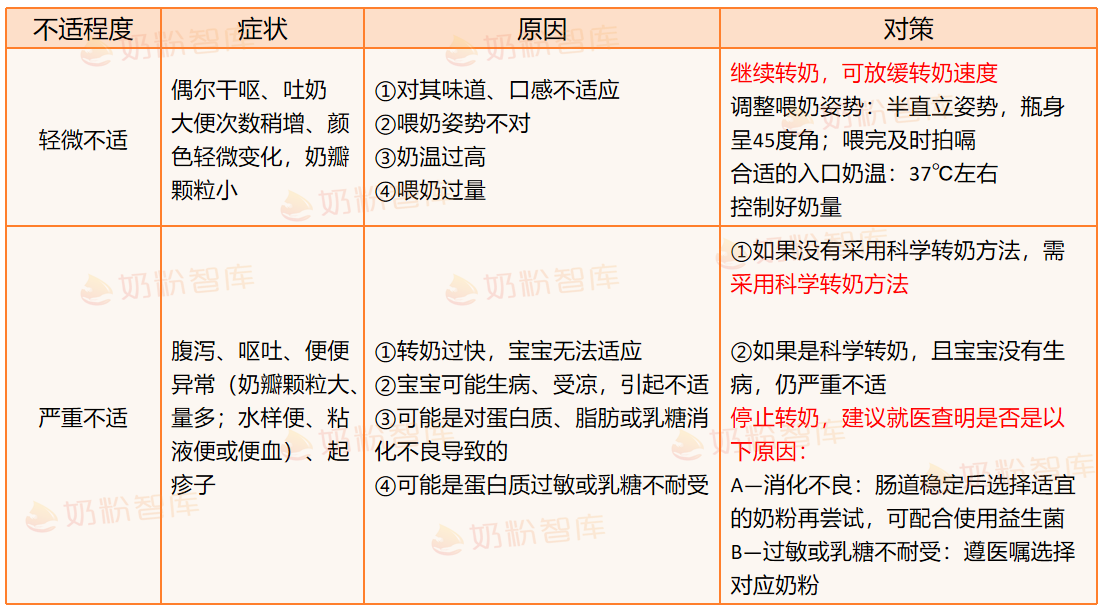 有的宝宝在转奶过程中可能会出现干呕、吐奶、拉肚子或者是拉奶瓣、绿便等不适症状,这个时候宝爸宝妈们需要根据宝宝不适的症状和程度采取相应措施,并决定是否暂停转奶。可以根据下表进行判断: