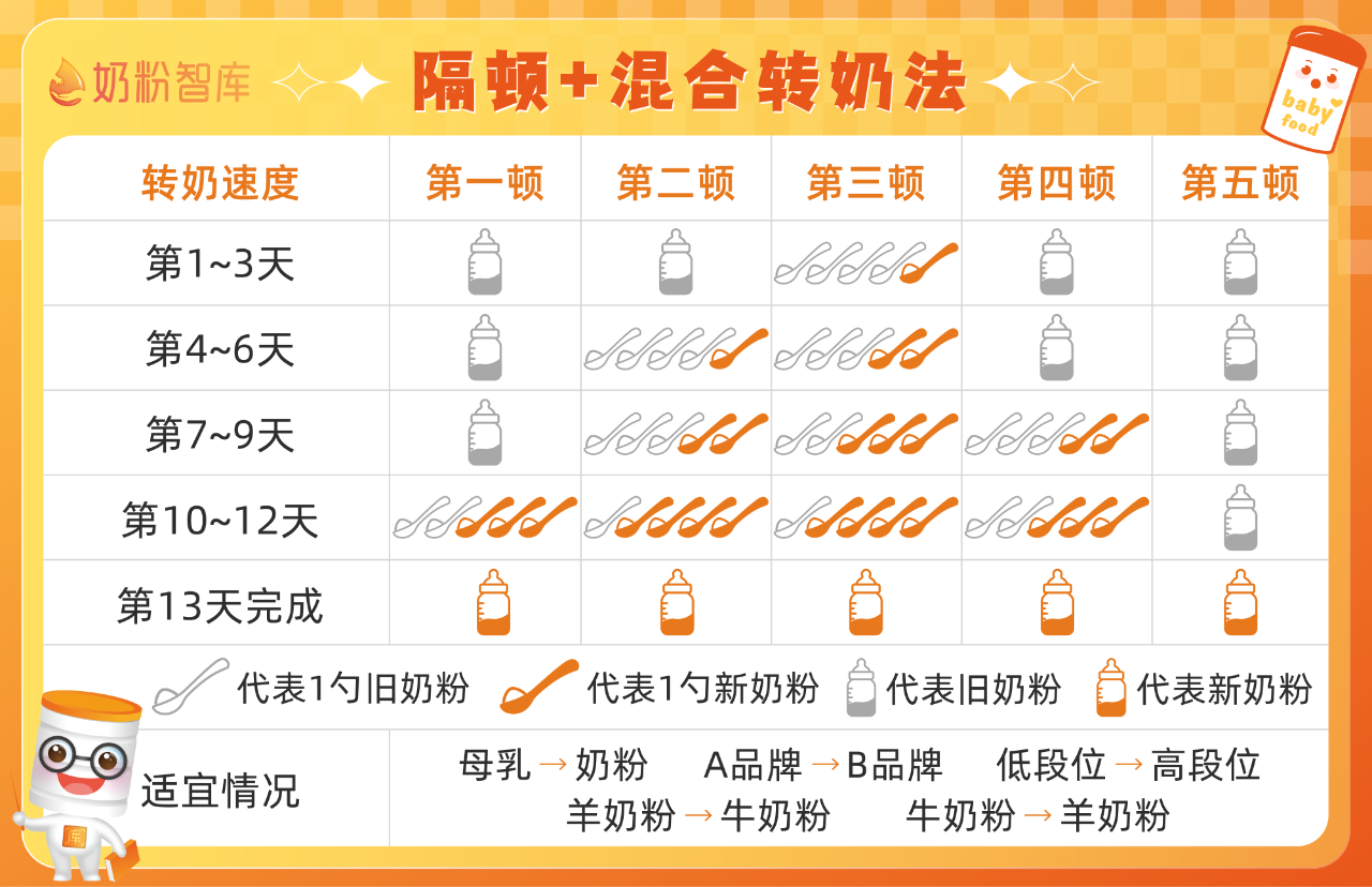 ③隔顿+混合转奶法(适用于宝宝依赖性、敏感性较强,或前两种方法转奶均失败的情况)