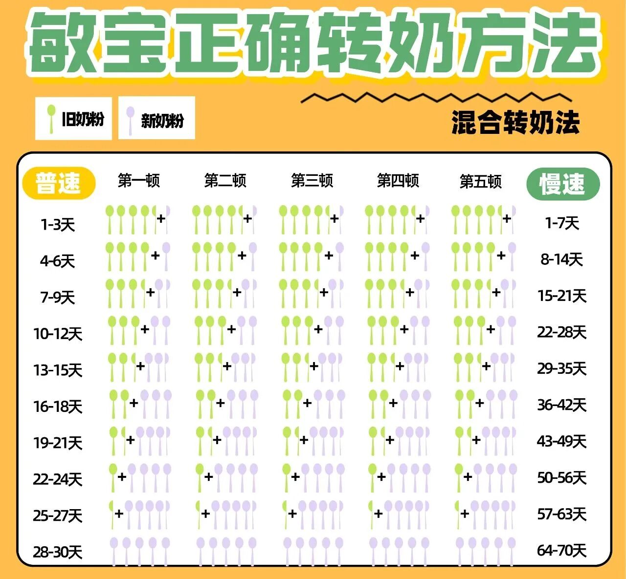 混合转奶过程中,每一阶段,一天里面每一顿的新奶粉比例是一样的,就比如刚转奶的1-3天,每一顿奶粉里都是添加一勺新奶粉。