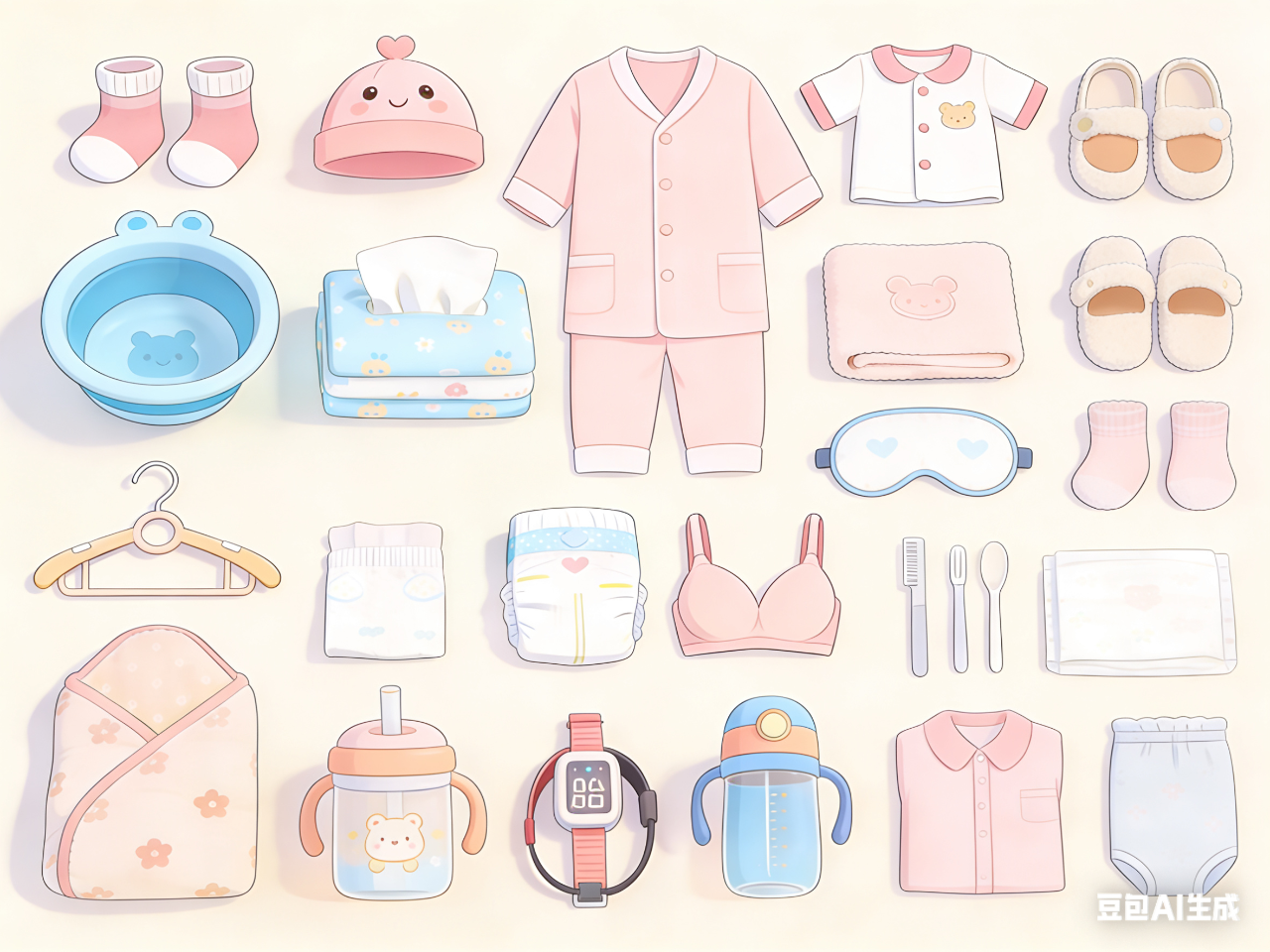 新生儿衣物、NB纸尿裤、新生儿专用硅胶软勺、包被、绵柔巾或湿巾;