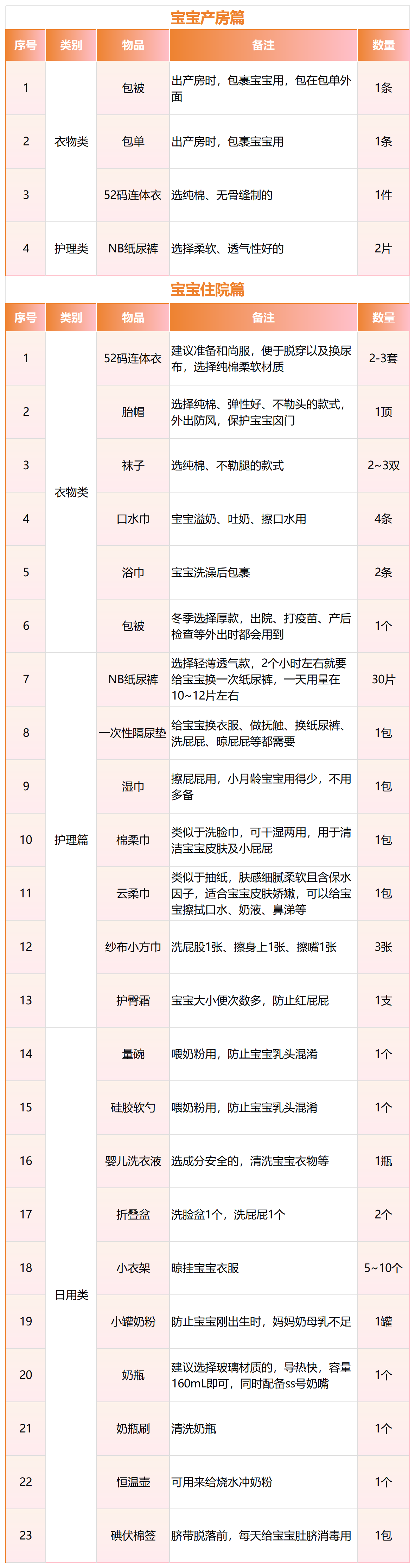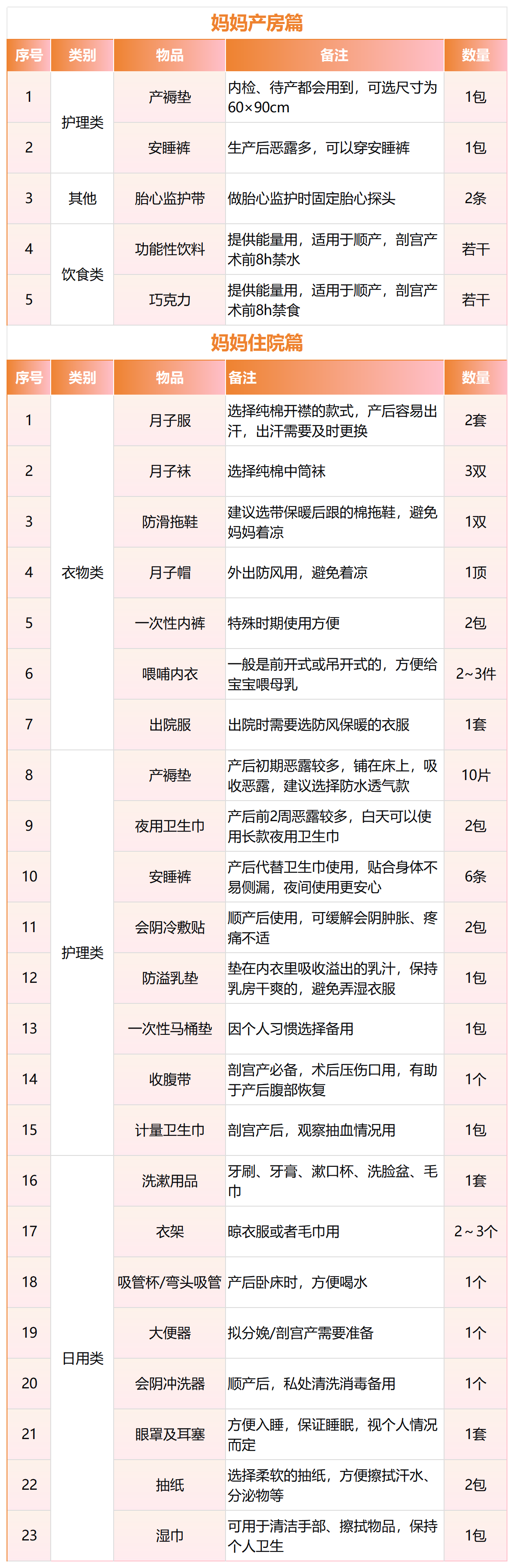 也有部分妈妈想要准备周全些,毕竟到医院才发现缺这少那,临时抓瞎不说,医院附近物价还高。别担心!粉哥又整理了“详细版”实用物品清单。同时,还把产房用和住院用的物品分开罗列,准爸妈们打包时按需分类,用起来稳稳当当、不慌乱!