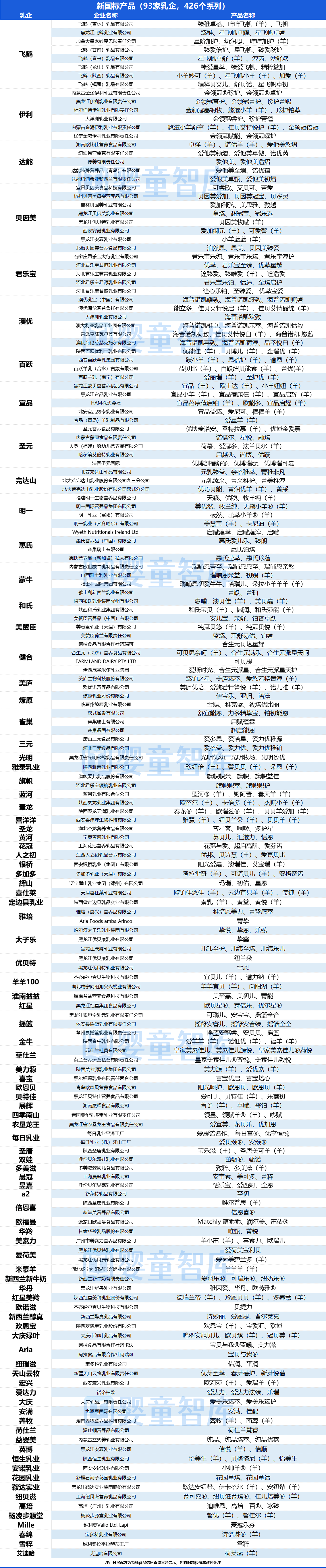包括伊利、飞鹤、君乐宝、澳优、惠氏、蒙牛、菲仕兰、宜品、圣元、光明、雅泰、和氏、达能、蓝河、a2、美赞臣、健合、美力源、雀巢、贝因美、欧恩贝、倍恩喜、圣唐、百跃、旗帜、喜宝、三元、辉山、贝特佳、美庐、多美滋、完达山、明一、太子乐、欧福曼、双娃、秦龙、圣龙、黄河、花冠、晨冠、人之初、燎原、华羚、多加多、美素力、喜仕莱、每日乳业、定边县乳业、农垦龙王、雅培、昱嘉、展辉、淮南益益、红星、优贝特、银桥、摇篮、金牛、爱荷美、四季南山、羊羊100、米慕羊、新西兰新牛奶、华丹、红星美羚、Arla、臻然、新西兰醇真、欢恩宝、大庆绿叶、宝多科乳业、天山云牧、宏兴、诺帝柏欧、大庆、荷仕兰、益婴美、英博、安嘉乳业、安诺乳业、花园乳业、鞍达实业、纽贝滋、高培、春绵、杨凌步源堂、艾迪哈等旗下产品,具体注册名单如下: