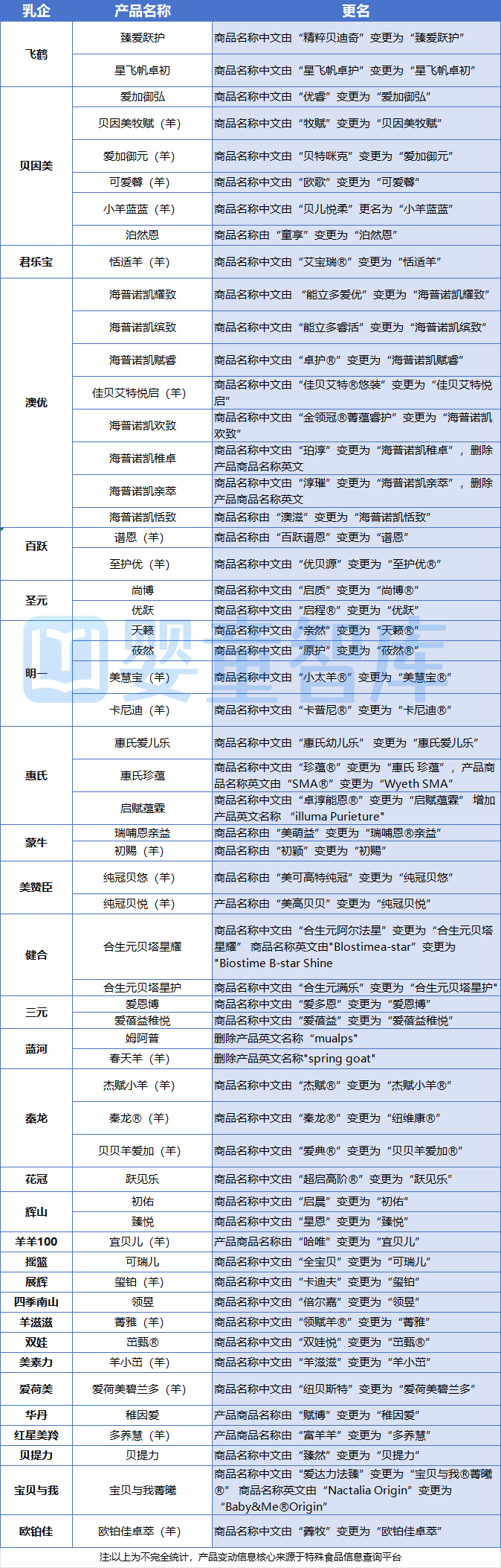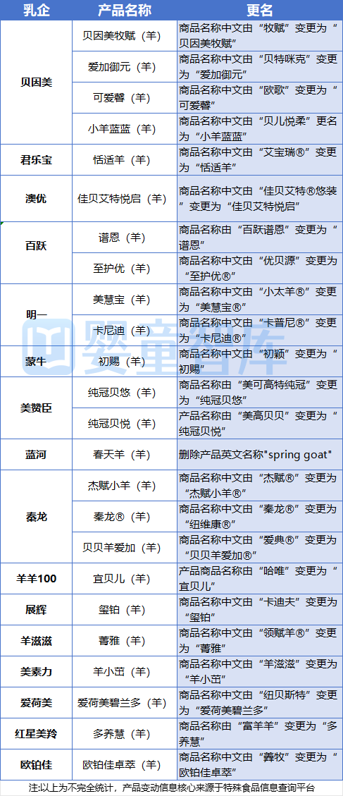 值得注意的是,自新国标正式实施后,羊奶粉产品的更名现象更为集中,统计共有24款羊奶粉更名。除前述君乐宝“艾宝瑞”更名“恬适羊”外,还包括蒙牛“初颖”更名为“初赐”、贝因美“贝特咪克”更名为“爱加御元”、百跃“优贝源”更名为“至护优”等。