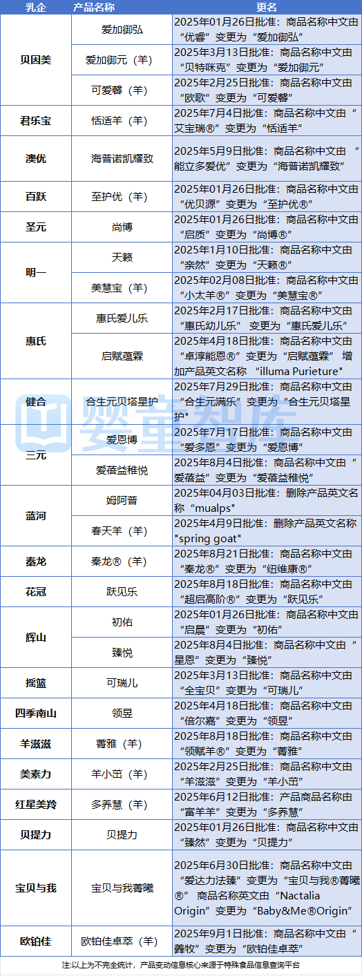 从时间来看,2023年13款产品进行更名;2024年16款产品进行更名;2025年已经有28款产品进行更名,比如“优睿”变更为“爱加御弘”、“羴牧”变更为“欧铂佳卓萃”、“爱达力法臻”变更为“宝贝与我菁曦”、“启晨”变更为“初佑”、“超启高阶”变更为“跃见乐”等。