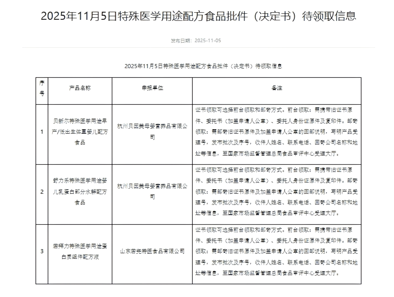 近日,国家市场监督管理总局食品审评中心发布新一批特殊医学用途配方食品批件(决定书)待领取信息,涉及贝因美、山东若尧特医食品两家企业。