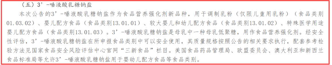 喜讯!近日,国家卫健委发布2026年第1号公告,3'-唾液酸乳糖钠盐(3'-SL)正式获批作为食品营养强化剂,准许添加至婴配粉、特医食品及调制乳粉中。包含2'-岩藻糖基乳糖(2'-FL)、乳糖-N-新四糖(LNnT)在内,截至目前,我国婴配粉可用HMO原料已达3种!