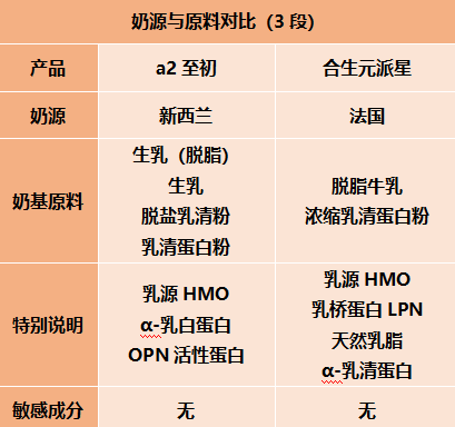 对比说明:奶粉对比主要从品牌背景、奶源与原料、营养与配方等方面展开,本次对比的产品为a2至初和合生元派星,均以3段为例,下面均省略段位。